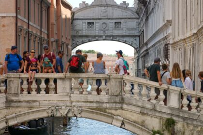 Tourists look at the sigh bridge in Venice, Italy, on August 25,…