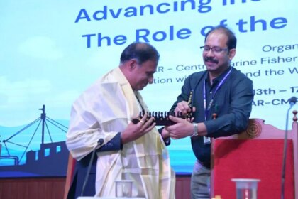 The director of CMFRI, Grinson George, congratulates Balaji Ramakrishnan, director of the…