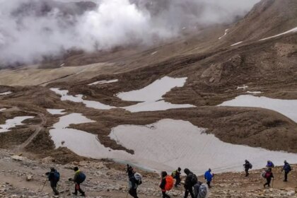Trekkers at the Kailash Manarovar Yatra towards the end of the walk.…
